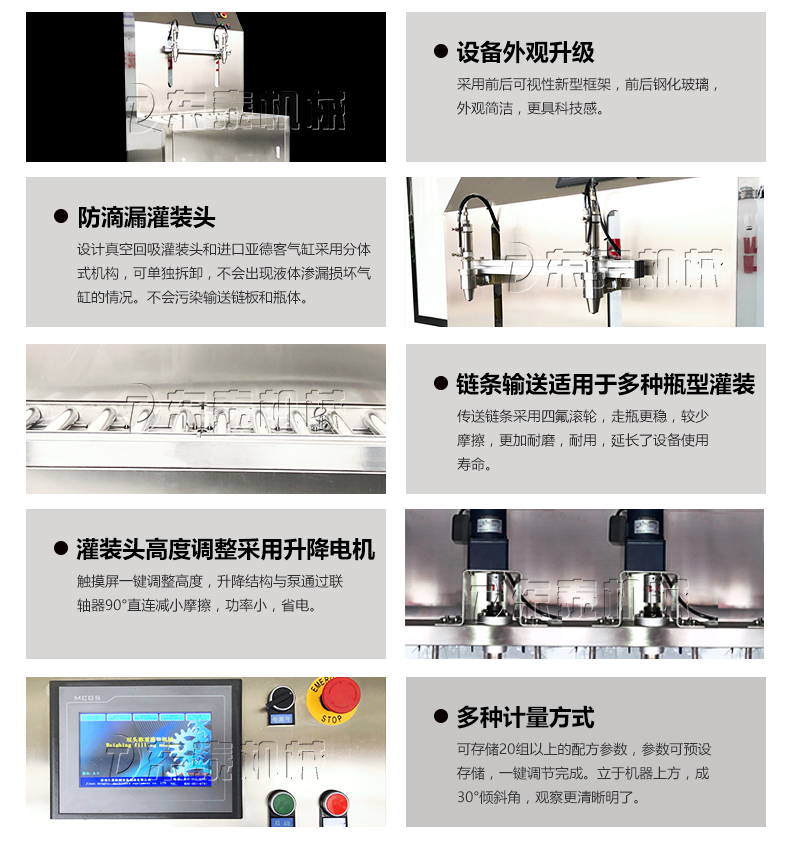 2:半自動(dòng)油脂灌裝機(jī)采用手動(dòng)上瓶單速控制灌裝流速,勻速灌裝,使用氣動(dòng)內(nèi)封閉式灌裝閥嘴可有效防止灌裝過程的滴漏;