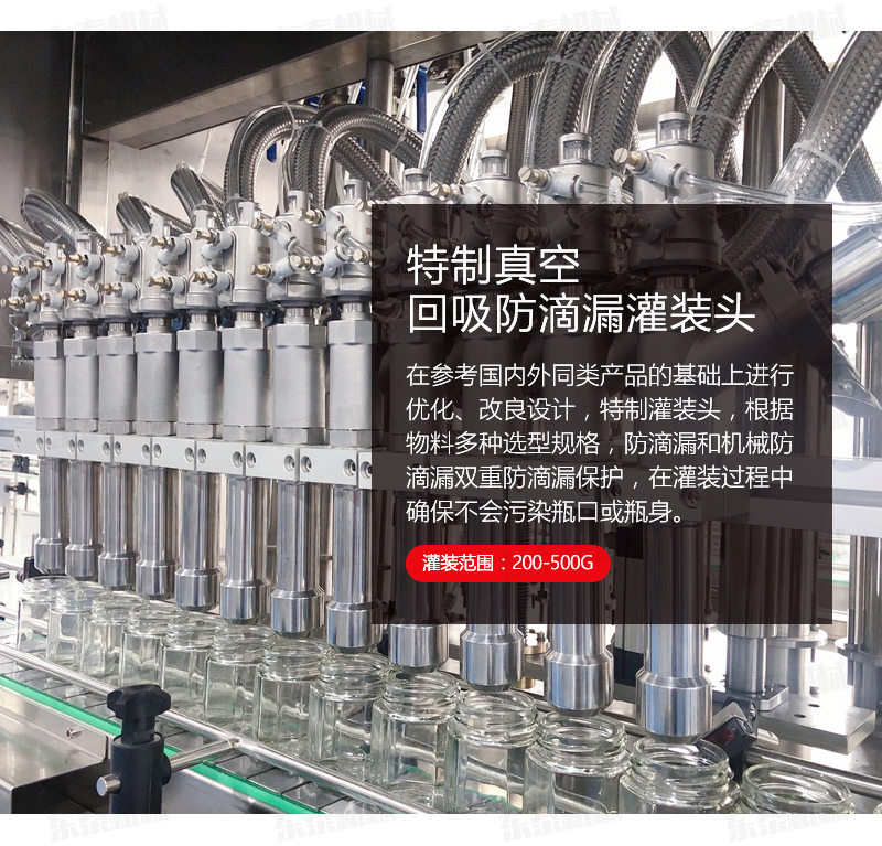 3、灌裝機采用橫推料的方式,大大縮短了下料斗到灌裝頭的距離,提高了灌裝速度,更重要的是解決了含油量大的物料在灌裝過程中出現(xiàn)的有些瓶油多,有些瓶醬多的灌裝難題,大大提高了灌裝精度。