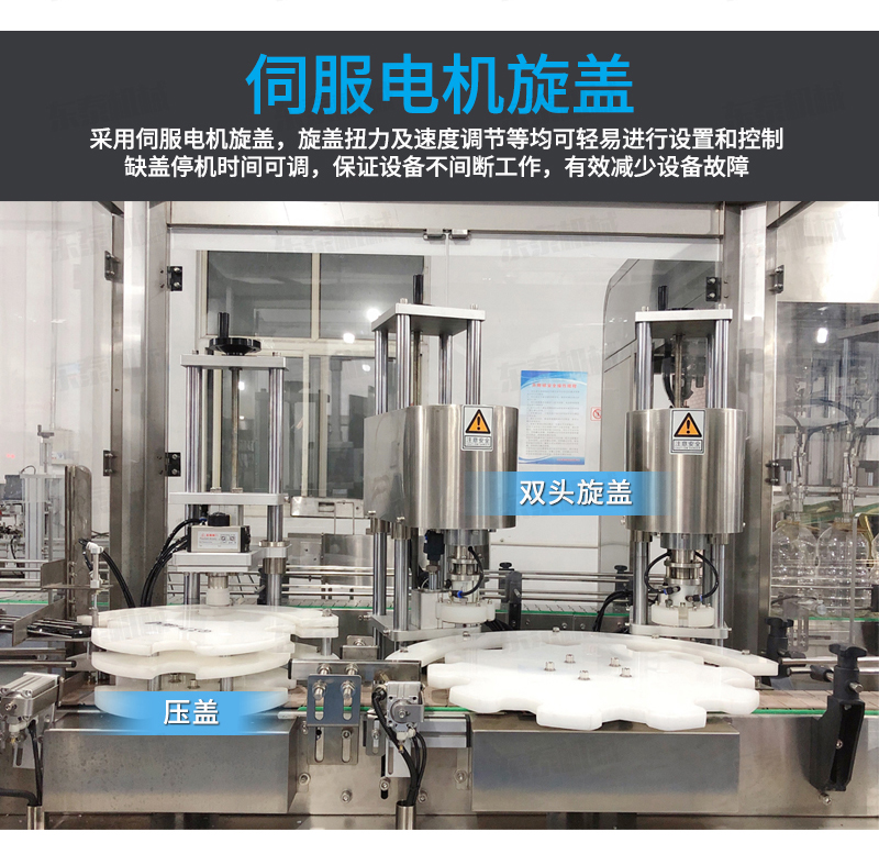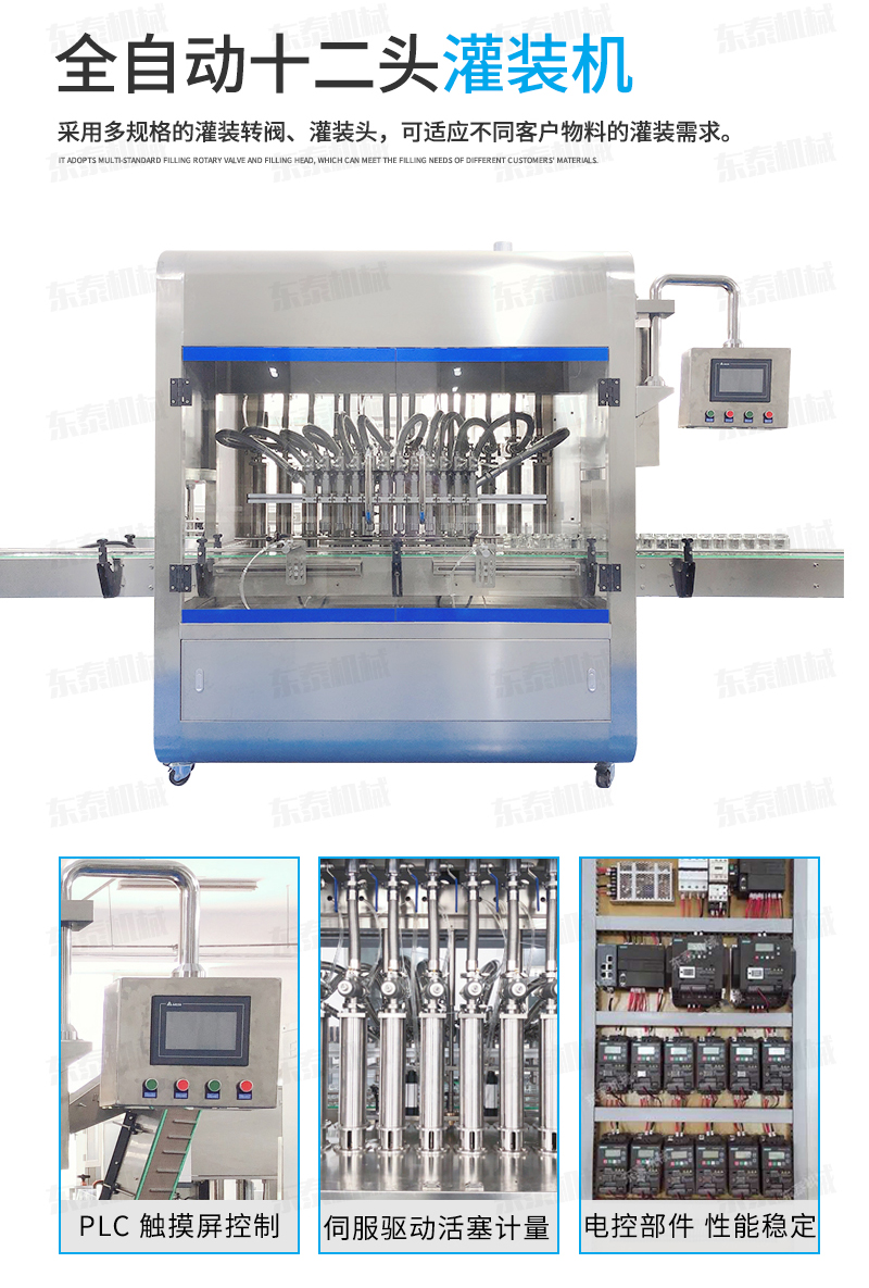 2、灌裝機以進口PLC電腦控制、伺服驅動計量,全彩色觸摸屏人機界面,一鍵完成計量切換確保容量之調(diào)整簡易、快捷、準確。是任何形式的灌裝機無法替代的;