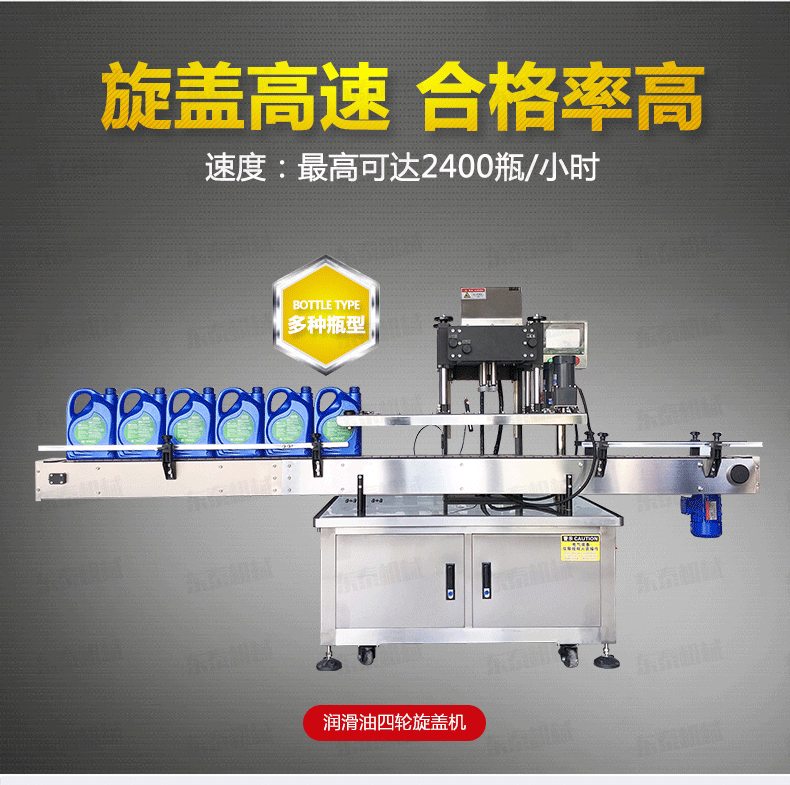 機油自動搓蓋機是參照機型改進設計、旋蓋速度快,合格率高、操作方便。可適用于食品、制藥、日化、農藥、化妝品等行業的不同瓶形的旋蓋。四臺調速電機分別用于供蓋、夾